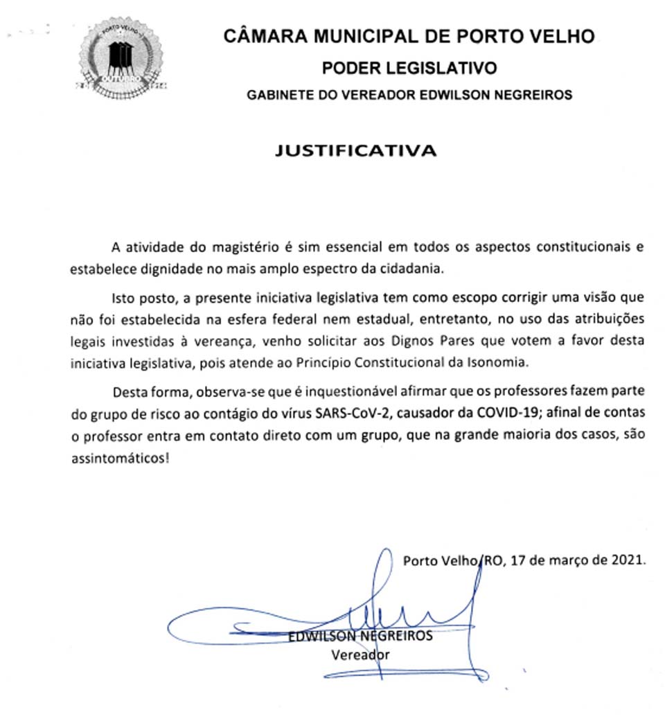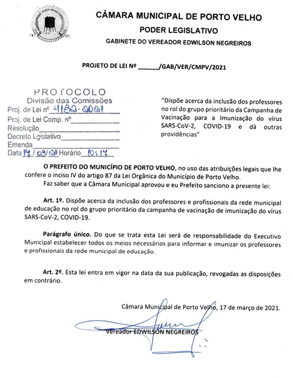 Porto Velho, RO - A Câmara Municipal de Porto Velho aprovou nesta quarta-feira (17) a Projeto de Lei 4132/21, de autoria do vereador Edwilson Negreiros, do PSB, também presidente da Casa de Leis-mirim.