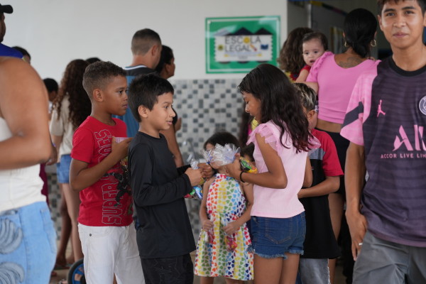 “Estamos aqui no Orgulho do Madeira, na escola Maria Francisca de Jesus, com mais uma ação de Páscoa. Tivemos brinquedos, pipoca, algodão doce, refrigerante e chocolate, mas o mais importante é o acolhimento e o fortalecimento dos vínculos familiares e comunitários”.